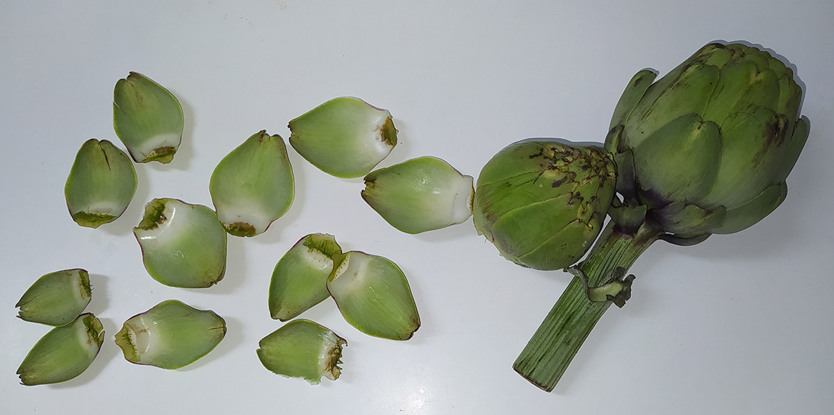 Eliminar las hojas más externas (son verdes completamente). Cuando empiece a asomar en la inserción de la hoja una parte blanca y carnosa, morder y arrastrar por los dientes, desechando el resto de la hoja. Cuanto más se progrese hacia el centro de la alcachofa, mayor parte comestible y menor coriácea. Cuando se llega al corazón se puedo comer a bocados o cortar en dados.