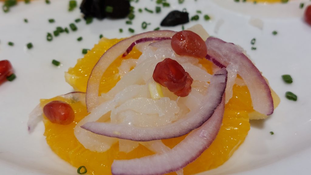 Romper el bacalao con los dedos, que estará perfectamente desalado. Pelar las naranjas y cortarlas en rodajas, componiéndolas en una fuente. Sobre las naranjas se colocarán los trozos de bacalao y luego se riega todo con un chorro de aceite de oliva.